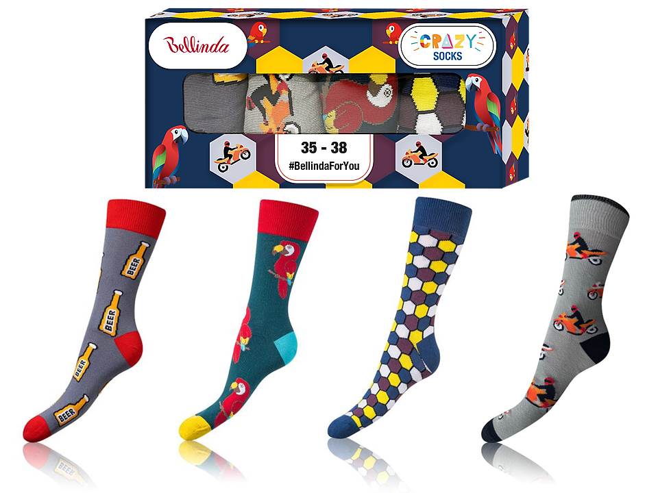 Sada 4 párů veselých crazy ponožek v hravých barevných kombinacích, které potěší každého milovníka originality. Díky vysokému podílu bavlny jsou ponožky pohodlné, prodyšné a vhodné pro celodenní nošení. Součástí je elegantní dárková krabička, takže jsou ideálním tipem na originální dárek.