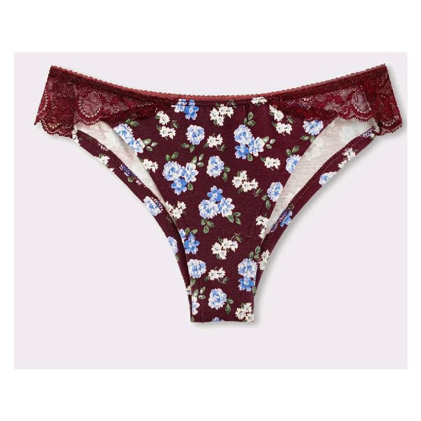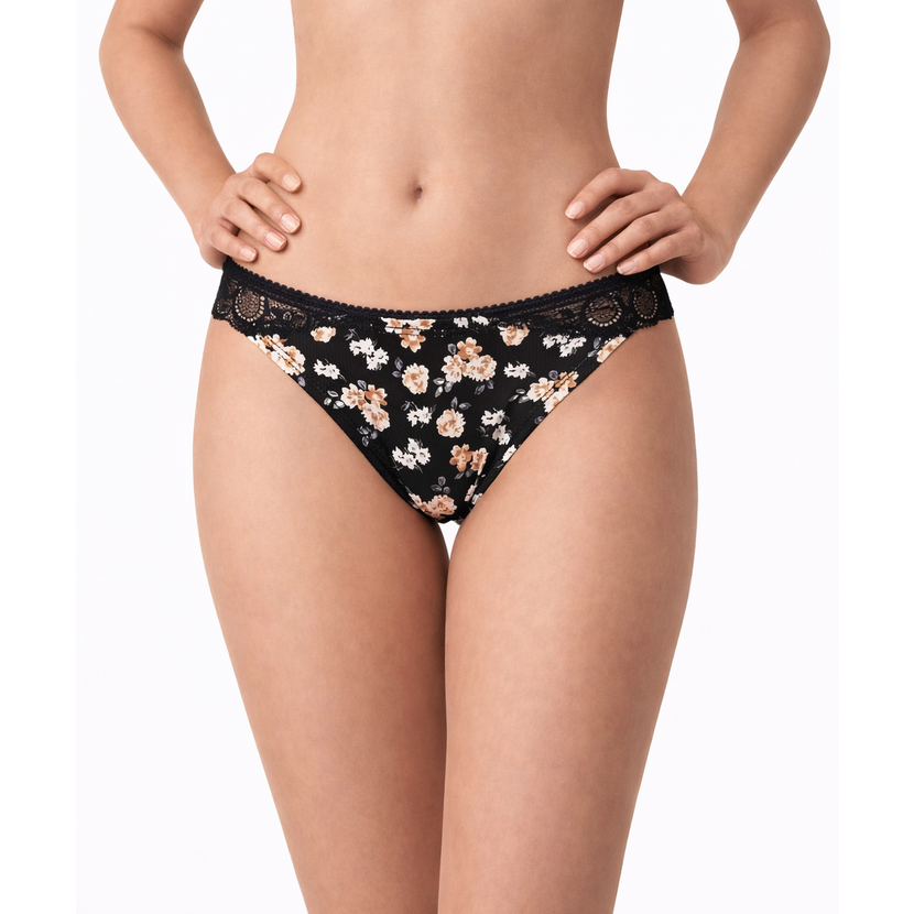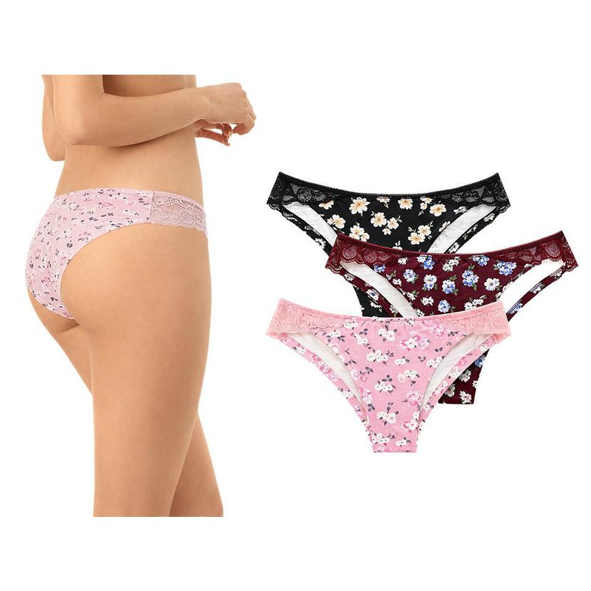 Dámské brazilky italské značky Jadea v praktickém balení po 3 kusech. Každý kus je v jiné módní barvě (černá, vínová – prugna, růžová) se stejným jemným květinovým vzorem.