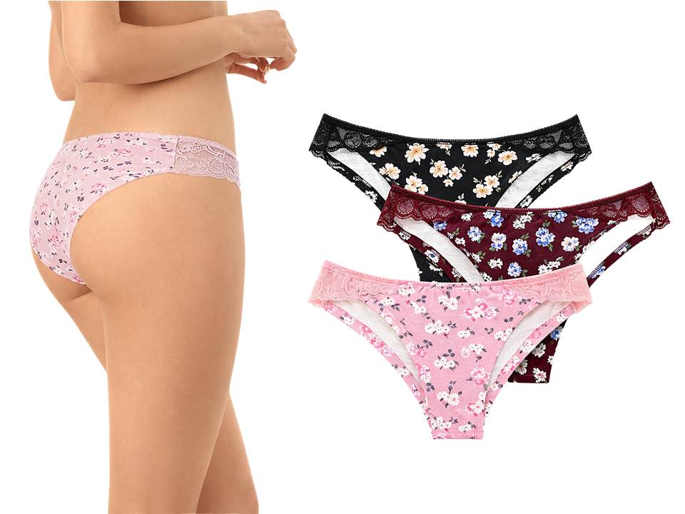 Dámské brazilky Jadea v balení 3 ks v módních barvách s jemným květinovým vzorem. Brazilský střih a krajka zepředu i po stranách zajišťují ženský vzhled i pohodlí při nošení.