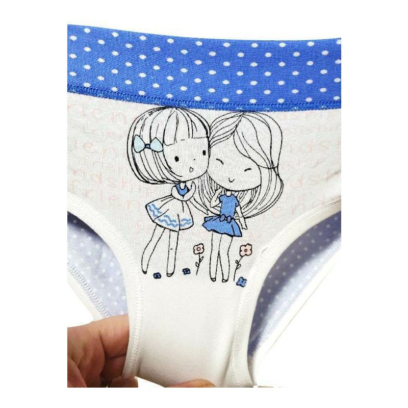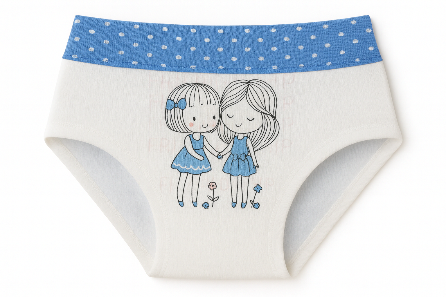 Dívčí bavlněné kalhotky Friendship ve velikosti 5/6 let, s jemným puntíkovaným pasem a roztomilým motivem dvou kamarádek. Příjemný měkký materiál a pohodlný střih zaručují maximální komfort při každodenním nošení.