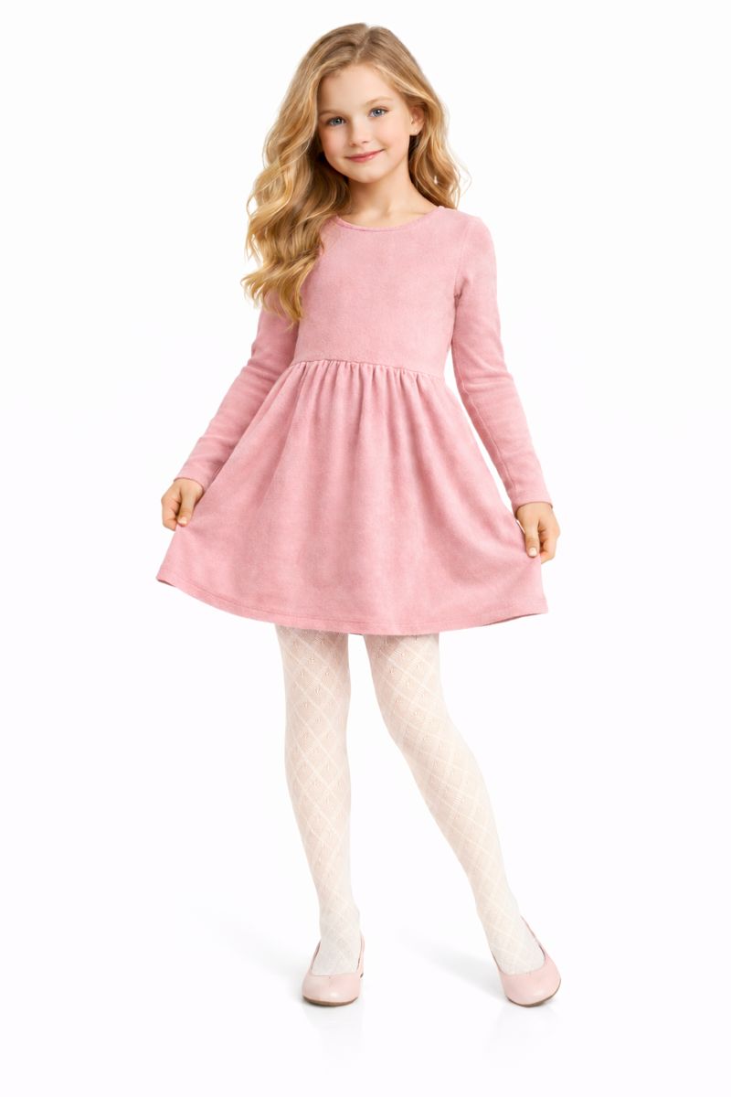 Dětské punčocháče v krémové barvě jsou vyrobeny z jemného a příjemného materiálu o síle 50 den, který zajišťuje komfort a dostatečné krytí. Povrch punčocháčů je zcela hladký, doplněný pouze jemným kosočtvercovým vzorem tvořeným drobnými dírkami, bez jakéhokoli dalšího dekoru uvnitř vzoru.