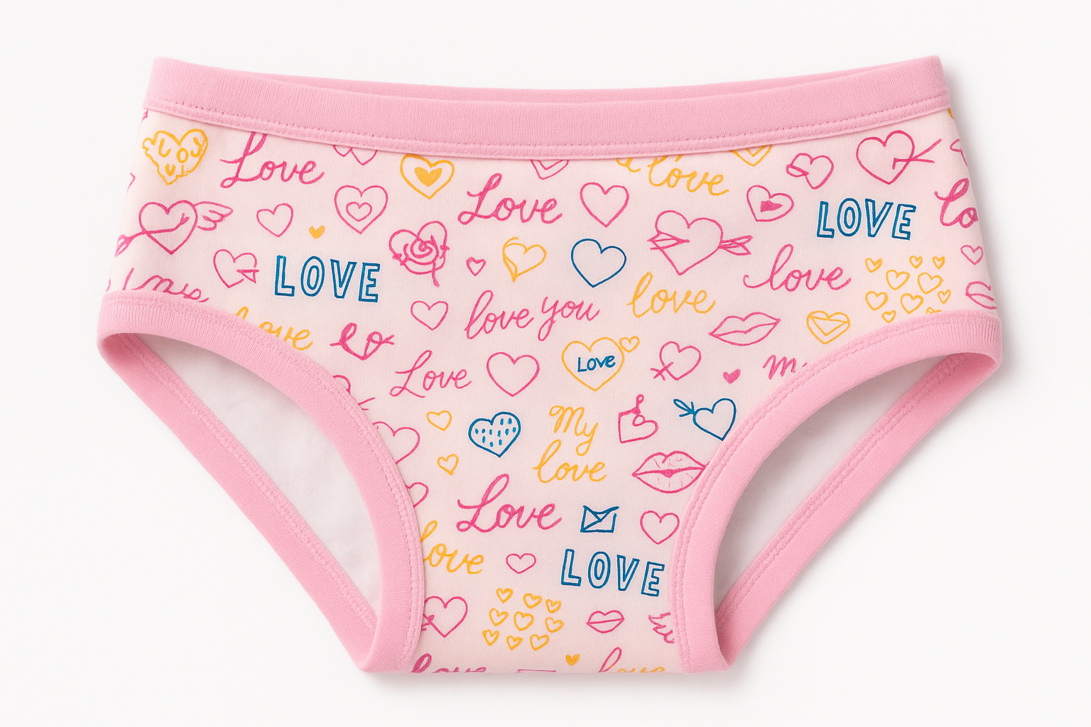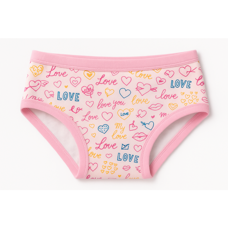 Přední díl zdobí barevný potisk s motivy srdíček, dopisů a nápisů Love, My love a I love you v odstínech růžové, modré a žluté. Základní látka je jemně růžová, doplněná o růžový lem, zatímco vnitřní část a zadní díl jsou bílé – díky tomu působí kalhotky svěže a čistě.