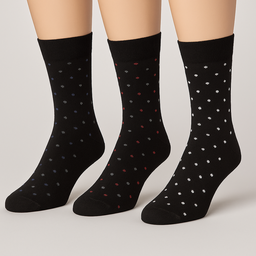 1 pár černých ponožek s dvoubarevnými puntíky (variace: modrá+šedá, červená+šedá nebo bílá+šedá)