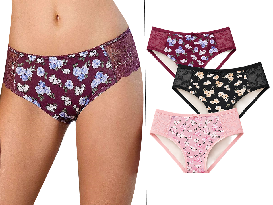 Každé balení obsahuje tři kusy v módních barevných variantách s jemným květinovým potiskem. Kalhotky jsou doplněny decentní průsvitnou krajkou na bocích, která dodává prádlu ženský a moderní vzhled.